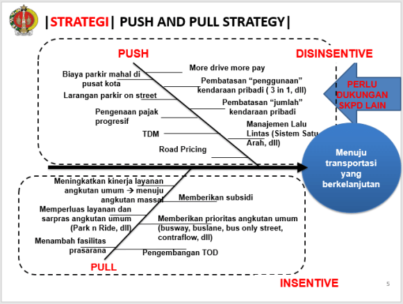 Berbagai rencana pengembangan pembangunan transportasi massal dan park & ridetersebut tentunya harus disertai penerapan strategi disinsentive agar tidak terlalu membebani APBN/APBD yang sangat terbatas. Peluang masyarakat untuk menerima strategi disinsentive (pembebanan biaya kepada pemilik kendaraan pribadi) ini akan semakin besar jika fasilitas transportasi massal dapat disediakan. Dan diharapkan sebagian besar masyarakat akan segera beralih menuju transportasi massal jika pembangunannya sudah terselesaikan.