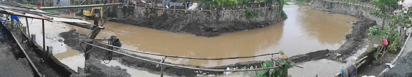 Hujan mulai rintik. Beberapa orang bergegas. Dua orang menuju excavator yang sedari tadi diam di bibir bendung. Sedang yang lainnya mengambil gerobak sorong untuk mengangkut karung pasir. Para ibu dan anak-anak menonton di pinggir kali. Tetapi juga ada beberapa anak yang menonton dari atas jembatan. Bahkan, seorang anak laki-laki juga membantu pengangkutan karung pasir.