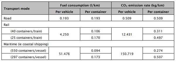 Dari data di atas dapat dilihat bahwa semakin banyak barang yang dibawa oleh moda transportasi tersebut, maka biaya bahan bakar dan emisi akan makin mengecil. Intinya, biaya dan kerusakan lingkungan yang dihasilkan oleh proses pengiriman barang logistik tersebut akan lebih sedikit.